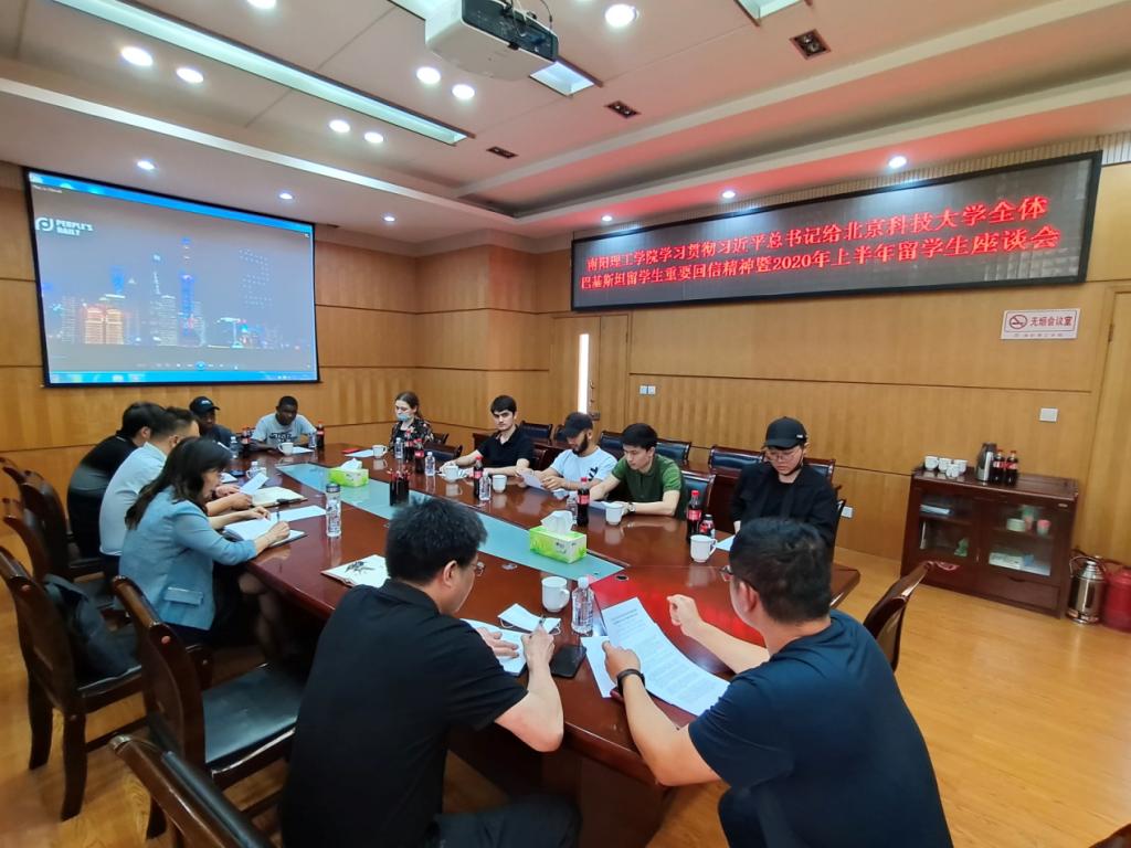 6月3日,我校召开学习习近平主席给北京科技大学全体巴基斯坦留学生回信精神暨2020年上半年留学生座谈会。副校长张爱红、国际交流合作中心全体人员、在校全体来华留学生现场参加座谈,部分回国留学生通过视频参加会议。